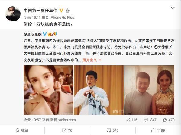 谁是邢珊?这两天跟他一起出现的关键词是“郭德纲”“女记者”。就是曹云金上一回6000字作文里提到的“被郭德纲睡,还倒给了郭德纲10万的女记者”。“第一嫌疑人”春妮否认之后,郭德纲这睡觉还赚钱的情人身份,还在石沉大海。直到郭德纲7000字反击曹云金时,又迅速浮出水面。